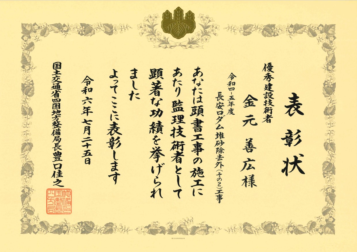 若手建設技術者奨励賞、徳島県知事表彰をダブル受賞