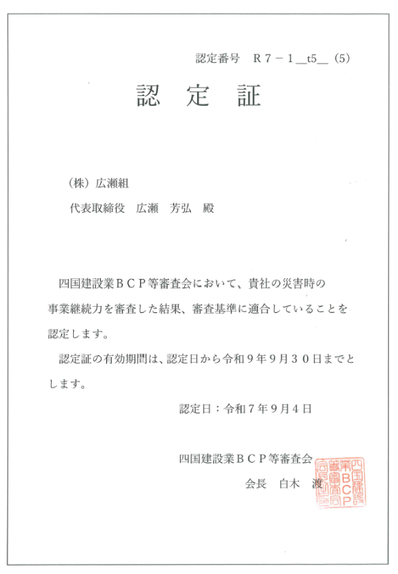 株式会社広瀬組は地元に根付いた建設業者として、地域社会と共生し、BCP活動を通して地域に貢献できる企業を目指します。